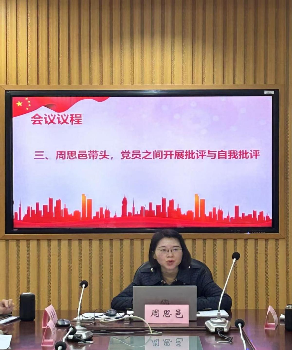 周思邑同志代表支部通报深入贯彻中央八项规定精神学习教育整改落实情况、2024年度组织生活会整改落实情况和本次征求意见情况,并代表支部委员会作对照检查,全面查摆支部工作短板;随后带头开展个人对照检查,主动剖析自身不足。全体党员逐一进行自我批评,开门见山、直面问题,相互批评、实事求是、坦诚中肯,重点围绕理论学习、作用发挥、队伍建设、工作创新、服务群众等方面提意见、点问题,切实达到 “红脸出汗、排毒治病” 的效果。