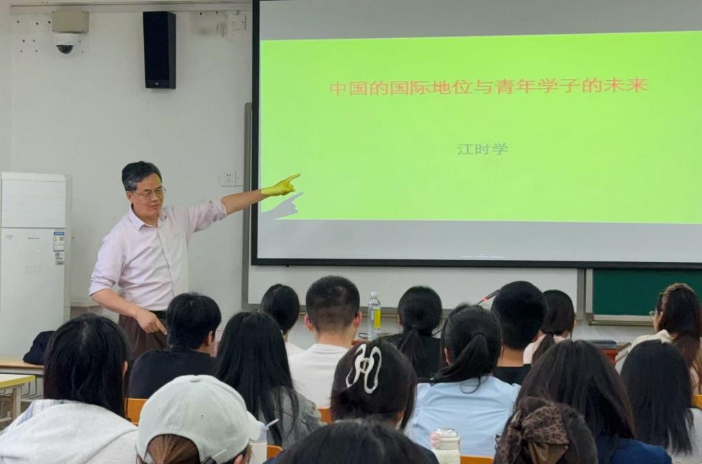 讲座中,江时学教授带领同学们从经济、科技、外交等多个维度,系统了解了中国近些年来的发展成就,并详细阐述了当今中国的国际地位与发展方向。同时,江教授鼓励同学们紧密关注国际国内时事,努力从各方面提升个人综合能力,强调当代青年既要加强专业知识学习,又要强化外语水平和写作能力,为国家发展注入青春活力。
