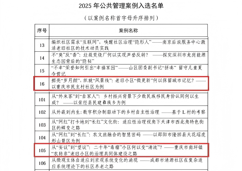 本次2篇入库案例,是学校公共管理师生团队深耕调研实践、潜心研究的智慧结晶,更是四川外国语大学-重庆图书馆共建的重庆市研究生联合培养基地共同努力的标志性成果。案例指导教师是重庆图书馆MPA指导教师王宁远、曾婧团队和国际关系学院余雅洁老师,学生团队由2023级硕士研究生王瑶、田维杰、赵骏豪同学组成。两篇案例题目分别是:《擦亮“岁月颜”,织就“风景线”:老旧小区“微更新”何以保留城市记忆?——以重庆市民主村社区为例》和《从“妄议”到“望议”:二十年“毒瘤”小区何以变“清流”?——重庆市南坪镇“农转非”老旧小区的治理共同体建设之路》。