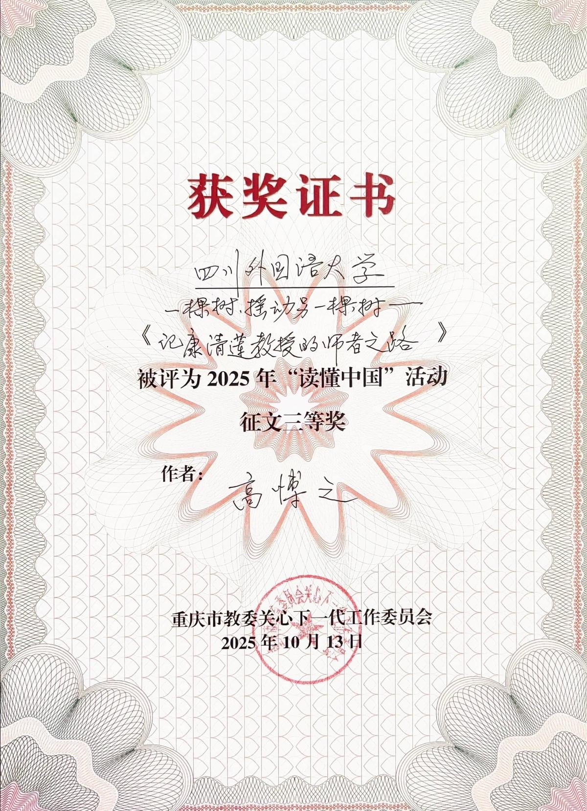 近日,重庆市教委关心下一代工作委员会公布了2025年“读懂中国”活动获奖作品名单。在学校关工委的悉心指导与学院的大力支持下,国际关系学院学子积极参与并斩获佳绩。高博之同学的征文作品《一棵树,摇动另一棵树——记康清莲教授的师者之路》荣获2025年“读懂中国”活动征文三等奖,王一丹老师荣获优秀辅导老师奖。
