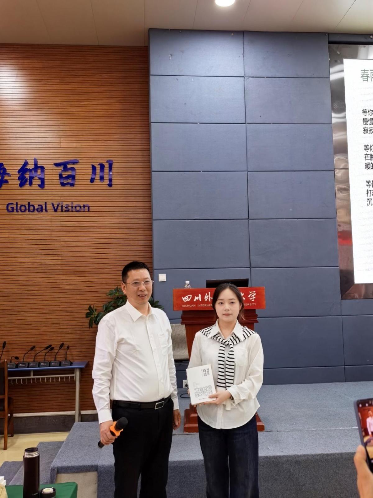 紧接着,刘邦祥请同学朗读他的代表作《春雨》,并送上了自己的诗作。诗意氤氲,如春雨润物,同学们恍若置身其间,思想教育的暖意也借着诗韵悄然流淌。