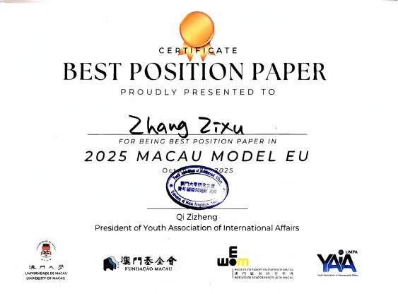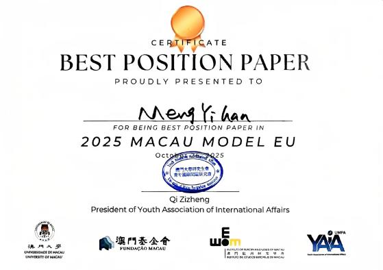 2025年10月26日,2025澳门大学模拟欧盟会议在澳门大学成功举行。此次模拟欧盟大赛由澳门欧洲研究学会IEEM和澳门大学青年国际问题研究会YAIA共同举办,主题为:欧盟对美国的贸易政策(工作语言为英文)。四川外国语大学纵横学社受邀参加,代表队荣获大赛最佳立场文件奖。